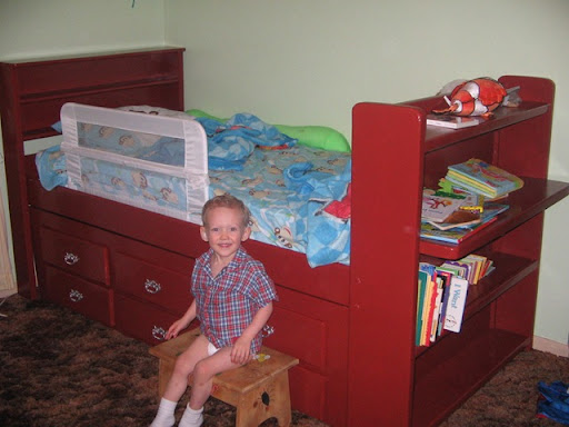 Well My big boy is growing up way too fast, I had a moment of sadness as his crib that at one point was HUGE to him became to small and had to be replaced. We bought him his new bed about a year and a half ago at a consignment store for $100 and it sat in storage until recently. Then we pulled it out, repainted it and set it up for Ethan. This was mainly my project of repainting it, yes Danny helped he sanded it down in the places with the real deep scratches and even did a little painting but the brunt of it was me. I even have to admit Ethan helped paint a small bit too. He thought it was too much fun and we had to let him help, it is his bed after all!