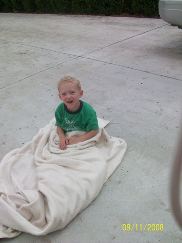We were playing outside and Ethan decided he needed to lay out on the driveway. Ok that's fine. But then he said he was cold and needed a blanket. Normally ok....except it was in the 90's with like a bagillion % humidity. I don't know how he could do it. He had fun though!